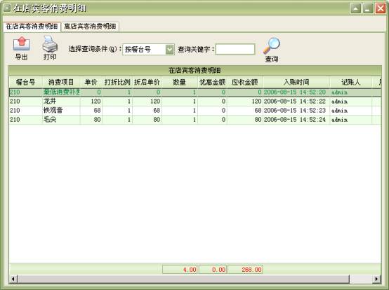 点击“打印消费清单”可将选中待结账宾客的消费信息打印输出到已连接并能正常工用的打印上(不做结账处理)。