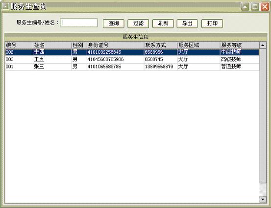 进入服务生查询窗口之后,在文本框中输入要查询的服务生的编号或姓名(简拼也可),按回车键在数据窗口中将显示出相对应的服务生信息。(当然也可通过点击“过滤”按钮选择查询范围再进行查询),点击“刷新”按钮数据表中将显示所有服务生的信息。