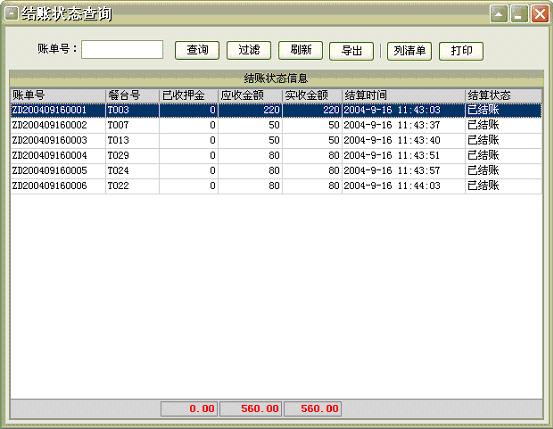 点击菜单“收银结账→结账状态查询”进入结账状态查询界面(如图12)。