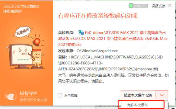 6、如果没关闭杀毒软件进行安装的,那么此时会有部分杀毒软件弹出提示,所有都点击允许本次操作即可;