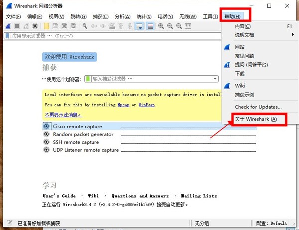 1、点击帮助,然后点击关于wireshark。