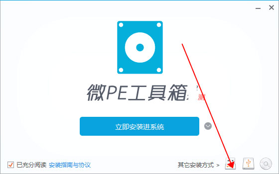 1、在本站下载你所需要微PE工具箱V2.3全新版,解压完成后双击打开工具,点击此按钮,进入U盘模式;