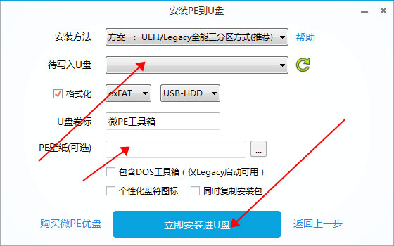 2、如图,选择你的U盘,接着选择你喜欢的壁纸导入即可,随后点击立即安装进U盘,等待安装完毕,这样把成功把微pe工具箱装进了U盘啦。