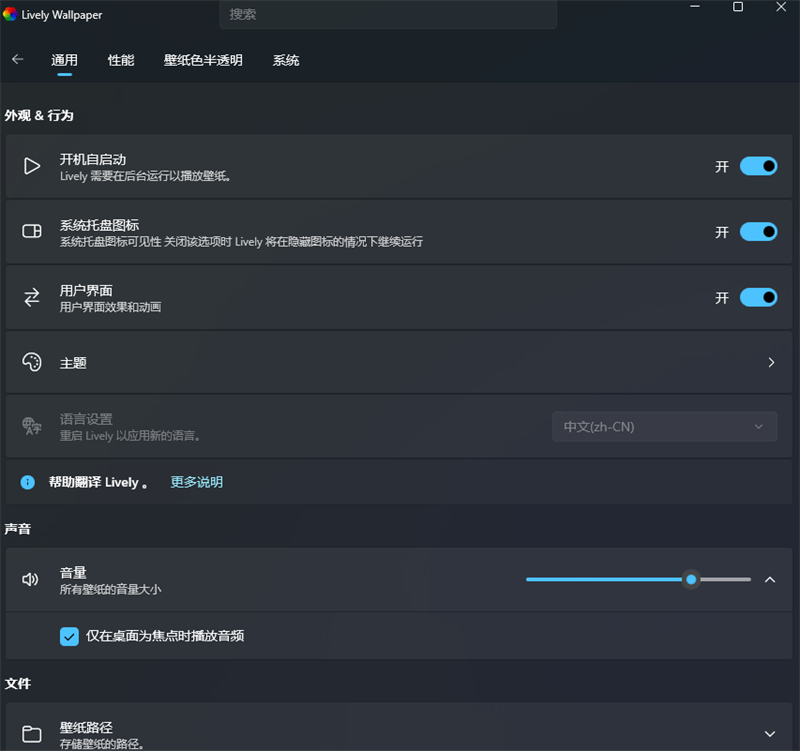 1、可以关闭动态壁纸的声音,设置全屏暂停、窗口失焦暂停等细节。