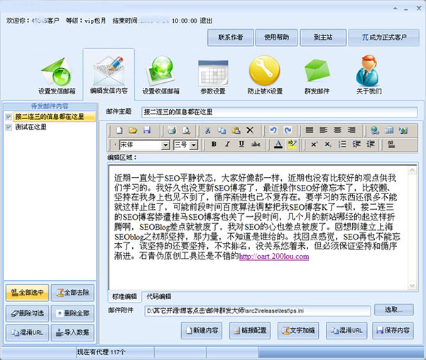 1、提供全文编辑模块支持所见所得操作,可加载附件并通过混淆URL功能防止邮件进入垃圾箱。