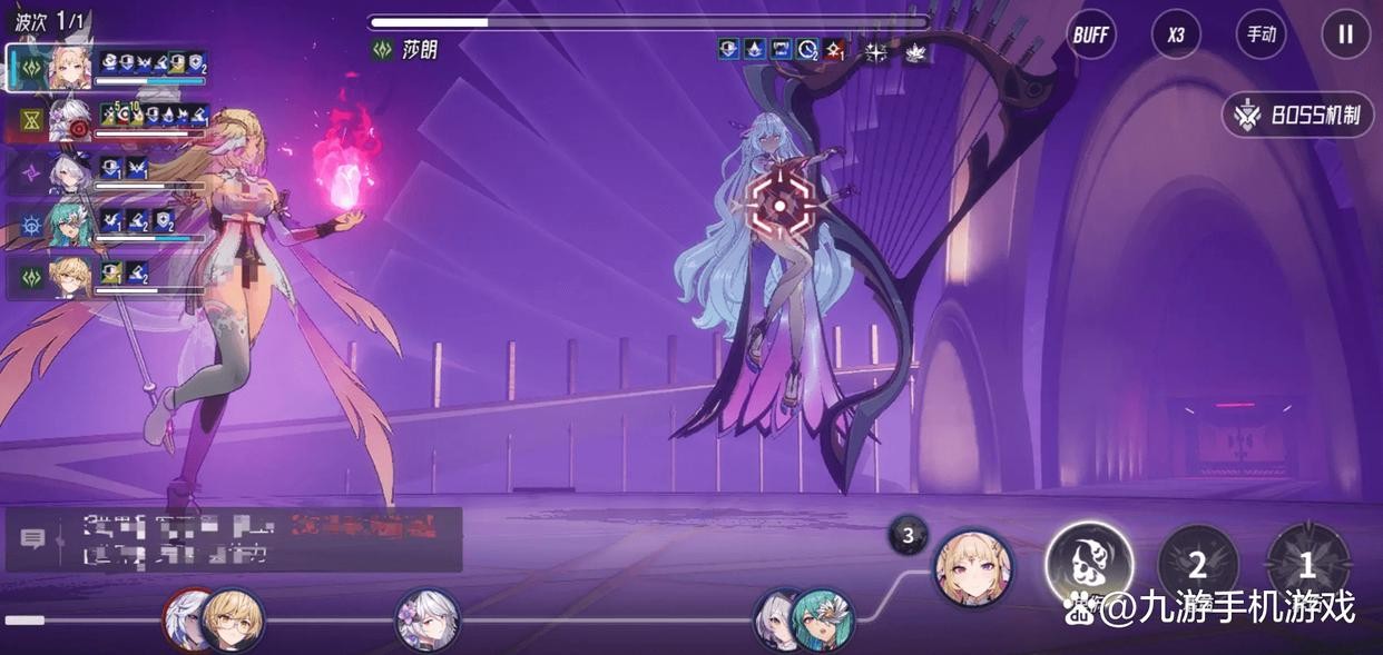 莎朗是我们爬塔中会遇到的难度boss,她总共有3个阶段,第1阶段我们通过酣梦的“睡眠花苞”,以及芙蕾雅的技能二来抵抗住持续伤害,同时去压莎朗的血线,等压到还有一丝血的时候,让凌罗开大附加免疫效果,然后下一位角色平a收掉进入2阶段;在2阶段花骨朵会随机选择两位角色来附加标记,当被标记者行动时,花骨朵若没有处于不可行动状态,会眩晕一位并立刻行动一次;