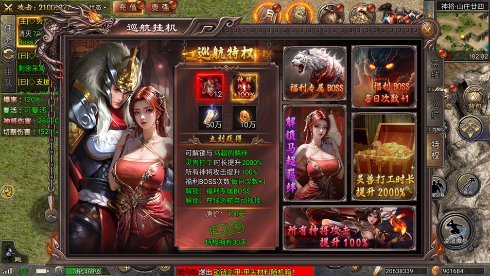 首先我们开通巡航特权,可跨地图自动找怪,灵兽可自动打工(获取主公材料)来解放双手,巡航特权还赠送了虞姬美人、每日福利boss额外挑战一次和50万灵符、十万传奇币,一千万的元宝