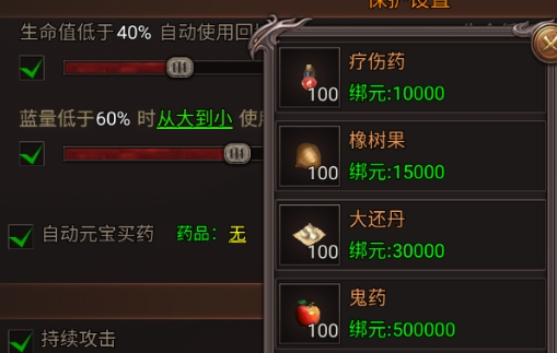 ②在设置里把战斗设置中的自动元宝买药勾选,药品随自身需求选择。