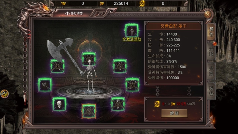 开服第三天解锁「小骷髅」核心战力系统!通过击杀对应等级BOSS掉落【骷髅残骸】,配合元宝即可合成八大骸骨部位: