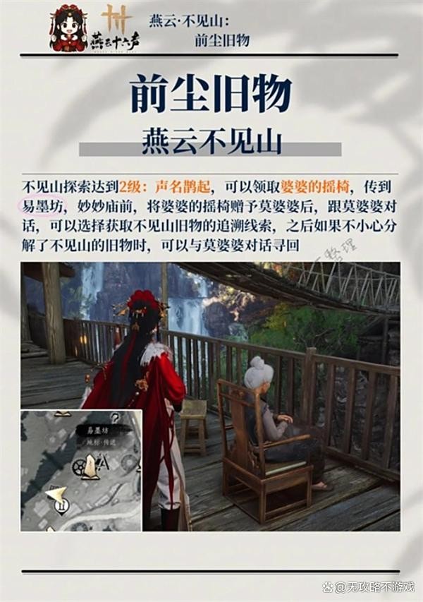 当不见山探索等级达到 2级(声名鹊起) 后,可获得任务道具婆婆的摇椅。