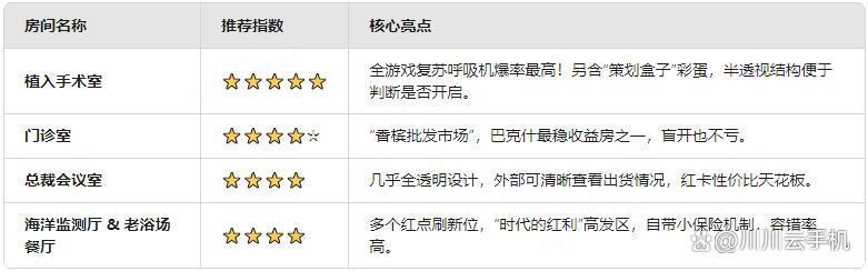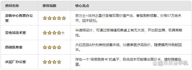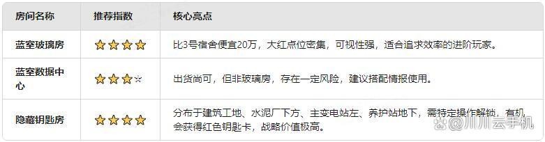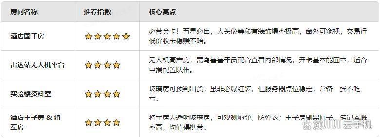 以下根据出货稳定性、物资价值、是否玻璃房/可观察、回本概率等维度综合评定,精选各地图最具价值的钥匙房。