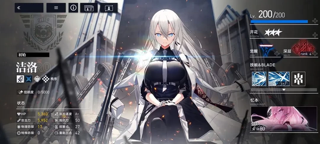 1.初始形态优势 白色制服的初始洁洛获得专属忆本后产生质变,输出能力达到顶尖水平。其综合属性接近六边形分布,兼具输出与生存能力,是下塔挑战的首选培养对象。