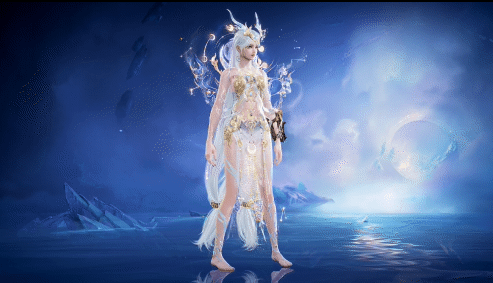 海上升明月,海水也丝丝攀上她的腿,来庇护她免受业火灼烧;轻纱金箔,华贵中透漏出一丝勾魂摄魄的妩媚,随风摇曳的下摆,缀着珍珠与金丝,摇曳生辉。