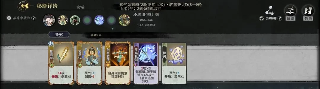 练气不D,则2轮上本,或首轮发剑意进行嫖牌,正常3轮上本。筑基大D,卡8-9轮。/同龟龟命防玩法也可以。